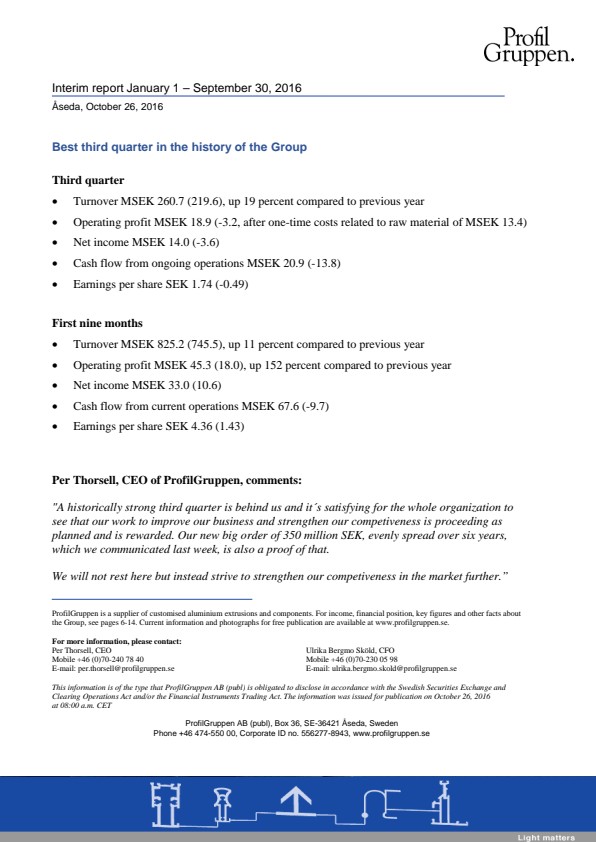 “A historically strong third quarter is behind us and it´s satisfying for the whole organization to see that our work to improve our business and strengthen our competiveness is proceeding as planned and is rewarded. Our new big order of 350 million SEK, evenly spread over six years, which we communicated last week, is also a proof of that.