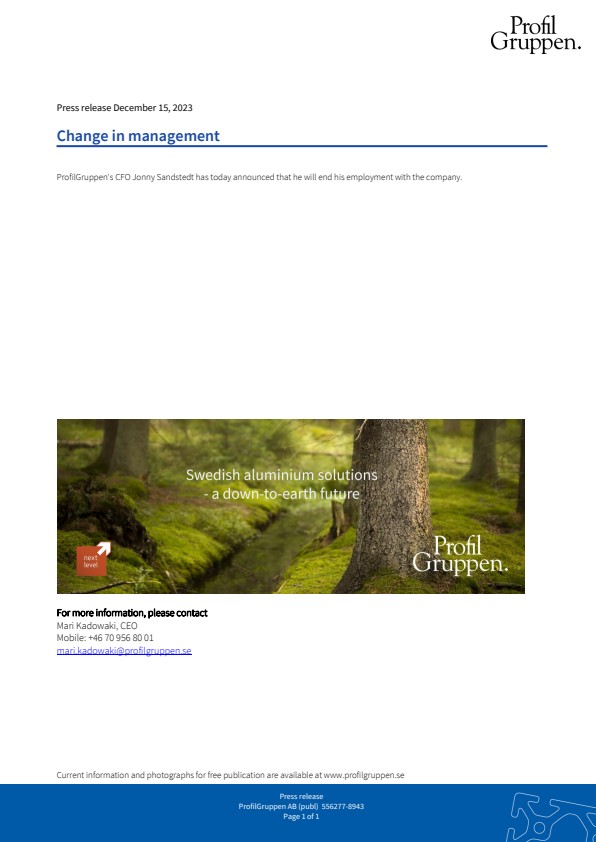 ProfilGruppen’s CFO Jonny Sandstedt has today announced that he will end his employment with the company.