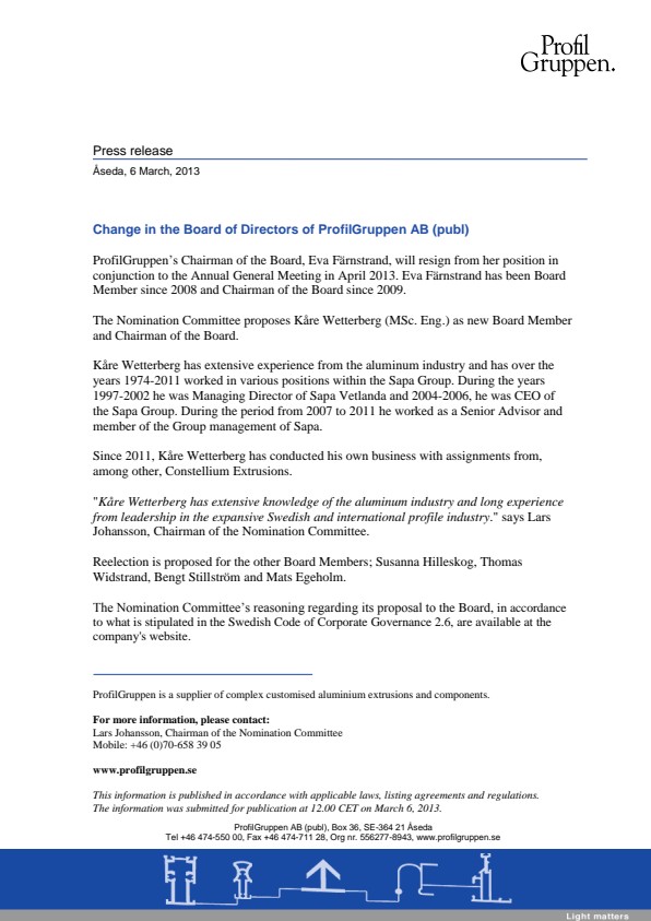 ProfilGruppen’s Chairman of the Board, Eva Färnstrand, will resign from her position in conjunction to the Annual General Meeting in April 2013. Eva Färnstrand has been Board Member since 2008 and Chairman of the Board since 2009.