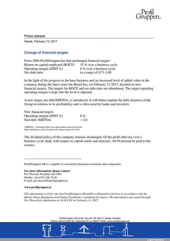 In the light of the progress in the base business and an increased level of added value in the company during the latest years the Board has, on February 13 2017, decided on new financial targets. The targets for ROCE and net debt ratio are abandoned. The target regarding operating margin is kept, but the level is adjusted.