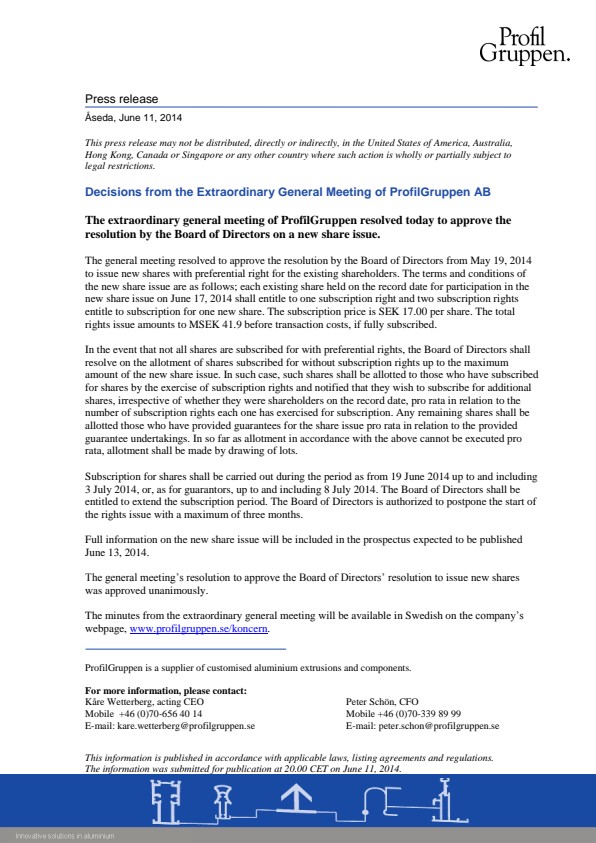 The extraordinary general meeting of ProfilGruppen resolved today to approve the resolution by the Board of Directors on a new share issue.
