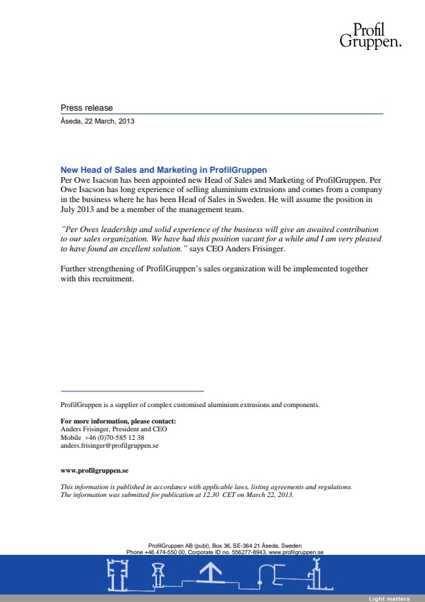 Per Owe Isacson has been appointed new Head of Sales and Marketing of ProfilGruppen. Per Owe Isacson has long experience of selling aluminium extrusions and comes from a company in the business where he has been Head of Sales in Sweden. He will assume the position in July 2013 and be a member of the management team.