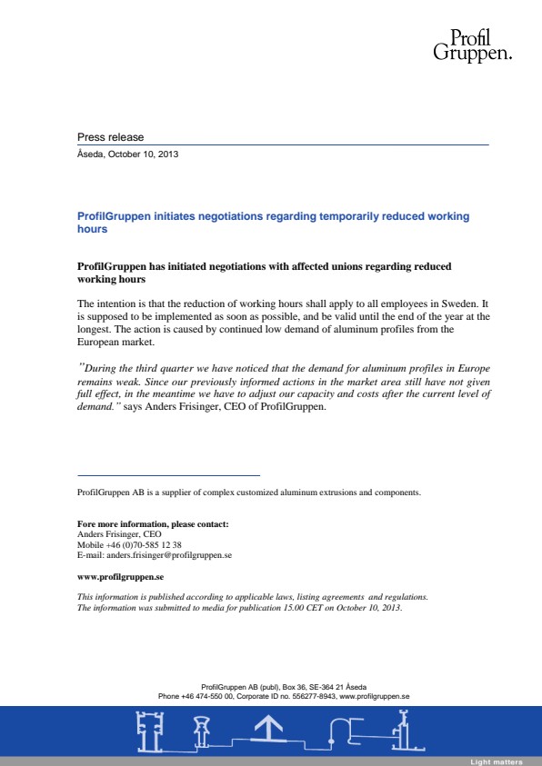 ProfilGruppen has initiated negotiations with affected unions regarding reduced working hours