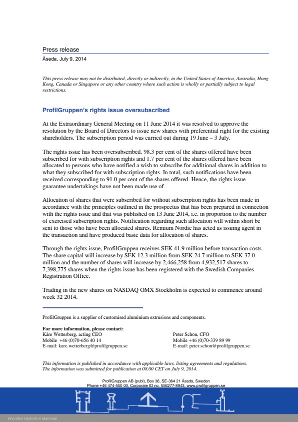 Through the rights issue, ProfilGruppen receives SEK 41.9 million before transaction costs. The share capital will increase by SEK 12.3 million from SEK 24.7 million to SEK 37.0 million and the number of shares will increase by 2,466,258 from 4,932,517 shares to 7,398,775 shares when the rights issue has been registered with the Swedish Companies Registration Office.