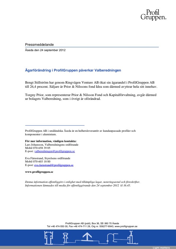 Bengt Stillström har genom Ringvägen Venture AB ökat sin ägarandel i ProfilGruppen AB till 26,4 procent. Säljare är Prior & Nilssons fond Idea som därmed avyttrar hela sitt innehav.