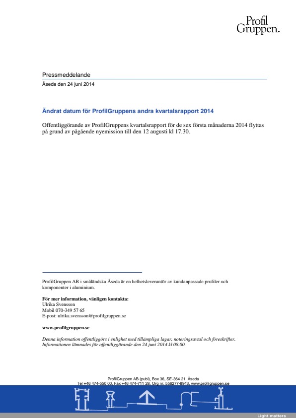 Offentliggörande av ProfilGruppens kvartalsrapport för de sex första månaderna 2014 flyttas på grund av pågående nyemission till den 12 augusti kl 17.30.