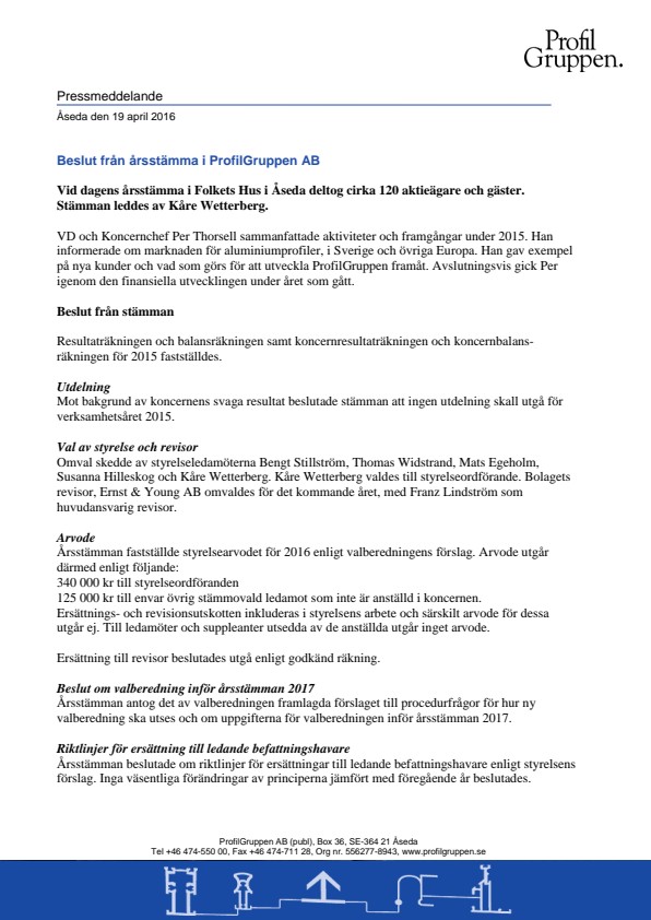 VD och Koncernchef Per Thorsell sammanfattade aktiviteter och framgångar under 2015. Han informerade om marknaden för aluminiumprofiler, i Sverige och övriga Europa. Han gav exempel på nya kunder och vad som görs för att utveckla ProfilGruppen framåt. Avslutningsvis gick Per igenom den finansiella utvecklingen under året som gått.