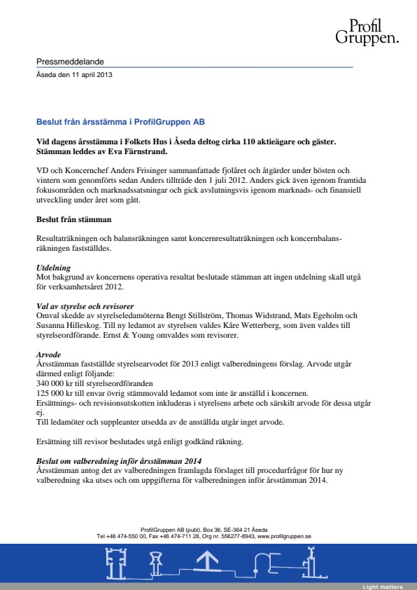 Sammandrag av VDs anförande och justerat protokoll från årsstämman kommer att publiceras på bolagets hemsida, www.profilgruppen.se/koncern.