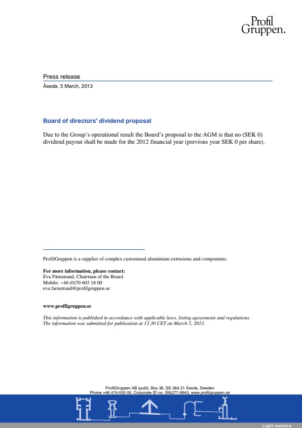 Due to the Group’s operational result the Board’s proposal to the AGM is that no (SEK 0) dividend payout shall be made for the 2012 financial year (previous year SEK 0 per share).