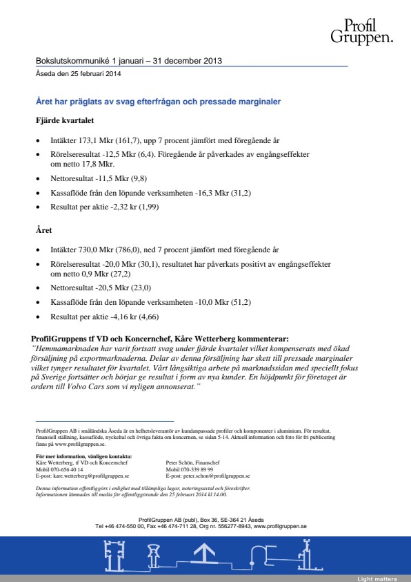 ”Hemmamarknaden har varit fortsatt svag under fjärde kvartalet vilket kompenserats med ökad försäljning på exportmarknaderna. Delar av denna försäljning har skett till pressade marginaler vilket tynger resultatet för kvartalet. Vårt långsiktiga arbete på marknadssidan med speciellt fokus på Sverige fortsätter och börjar ge resultat i form av nya kunder. En höjdpunkt för företaget är ordern till Volvo Cars som vi nyligen annonserat.”