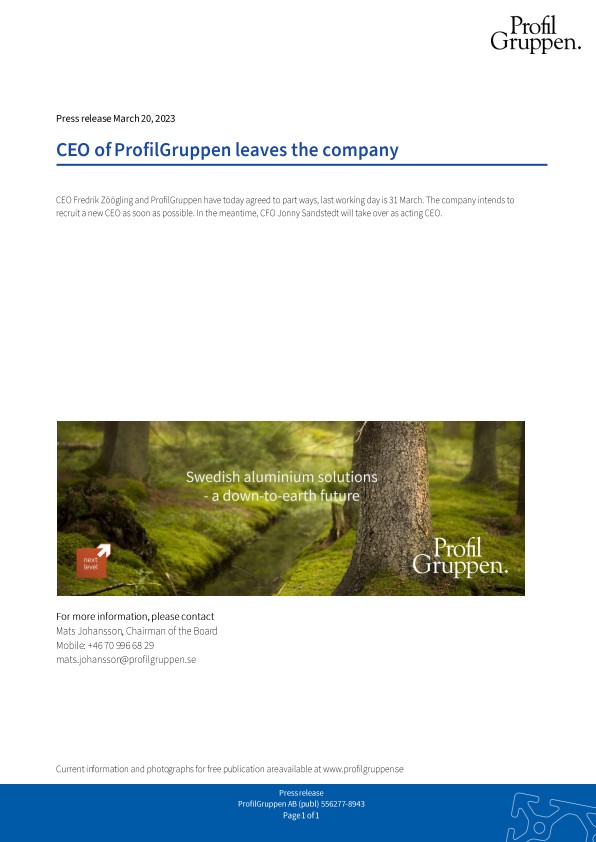 CEO Fredrik Zöögling and ProfilGruppen have today agreed to part ways, last working day is 31 March. The company intends to recruit a new CEO as soon as possible. In the meantime, CFO Jonny Sandstedt will take over as acting CEO.