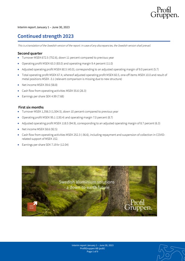 · Total operating profit MSEK 67.4, whereof adjusted operating profit MSEK 60.5, one-off items MSEK 10.0 and result of metal positions MSEK -3.1 (relevant comparison is missing due to new structure)