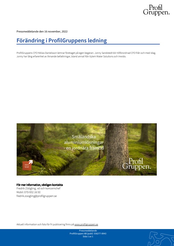 ProfilGruppens CFO Niklas Danielsson lämnar företaget på egen begäran. Jonny Sandstedt blir tillförordnad CFO från och med idag. Jonny har lång erfarenhet av liknande befattningar, bland annat från Xylem Water Solutions och Inwido.