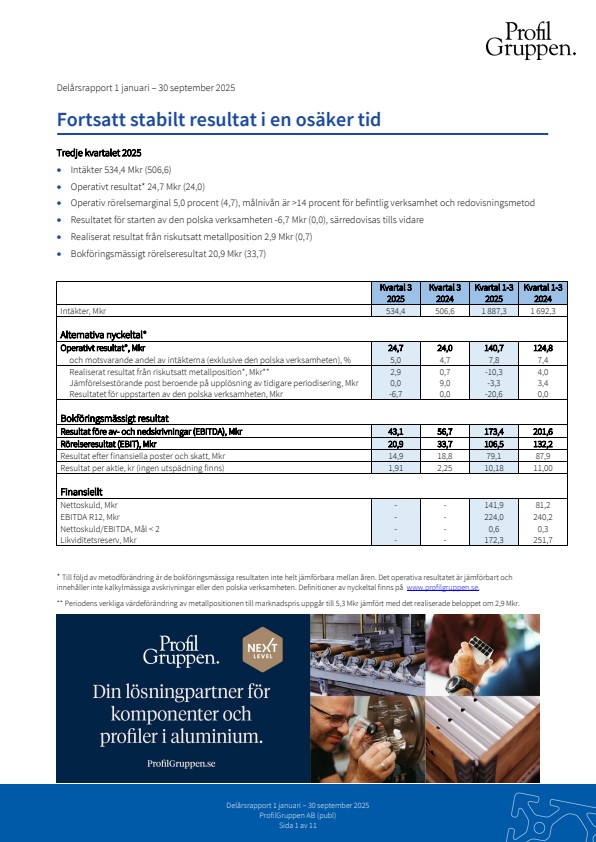 * Till följd av metodförändring är de bokföringsmässiga resultaten inte helt jämförbara mellan åren. Det operativa resultatet är jämförbart och innehåller inte kalkylmässiga avskrivningar eller den polska verksamheten. Definitioner av nyckeltal finns på www.profilgruppen.se.
