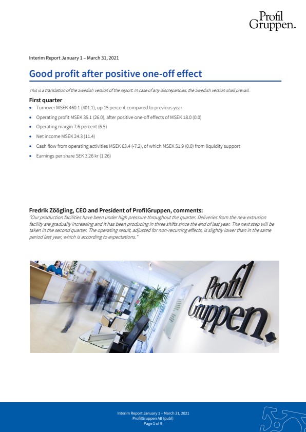 ”Our production facilities have been under high pressure throughout the quarter. Deliveries from the new extrusion facility are gradually increasing and it has been producing in three shifts since the end of last year. The next step will be taken in the second quarter. The operating result, adjusted for non-recurring effects, is slightly lower than in the same period last year, which is according to expectations.“