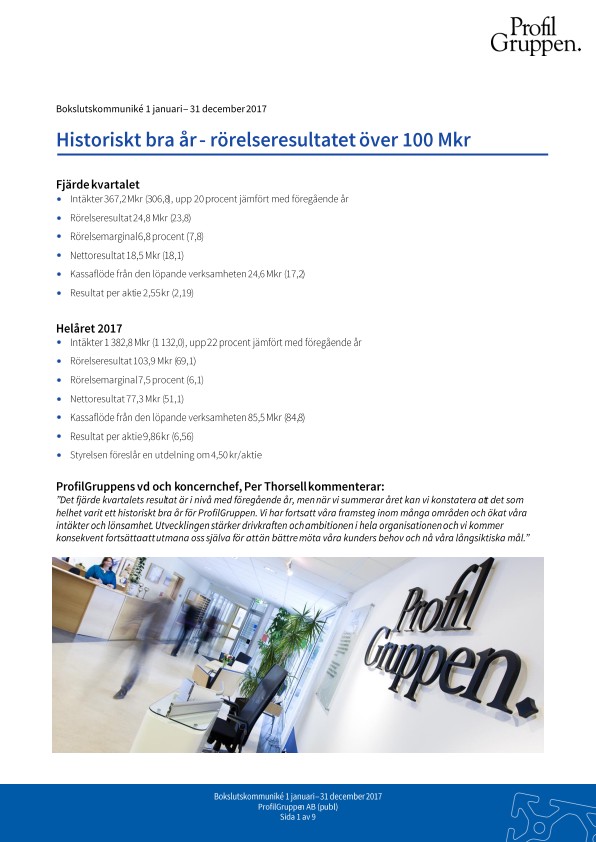 ”Det fjärde kvartalets resultat är i nivå med föregående år, men när vi summerar året kan vi konstatera att det som helhet varit ett historiskt bra år för ProfilGruppen. Vi har fortsatt våra framsteg inom många områden och ökat våra intäkter och lönsamhet. Utvecklingen stärker drivkraften och ambitionen i hela organisationen och vi kommer konsekvent fortsätta att utmana oss själva för att än bättre möta våra kunders behov och nå våra långsiktiska mål.”