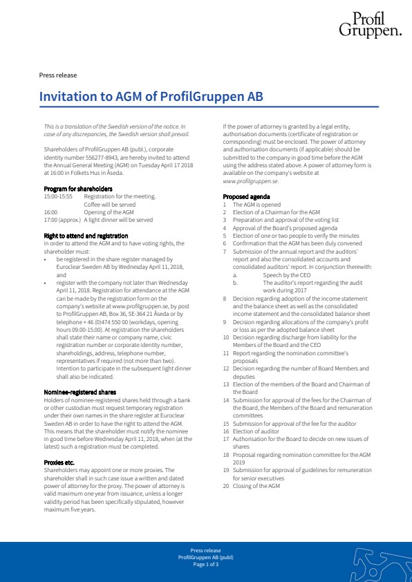 Shareholders of ProfilGruppen AB (publ.), corporate identity number 556277-8943, are hereby invited to attend the Annual General Meeting (AGM) on Tuesday April 17 2018 at 16:00 in Folkets Hus in Åseda.
