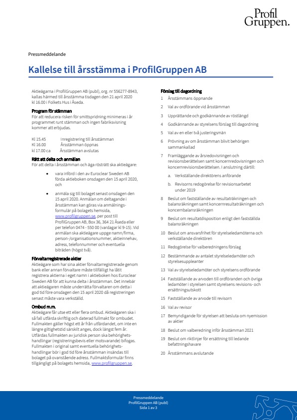 Aktieägarna i ProfilGruppen AB (publ), org. nr 556277-8943, kallas härmed till årsstämma tisdagen den 21 april 2020