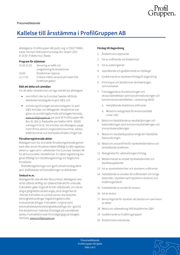 Aktieägarna i ProfilGruppen AB (publ), org. nr 556277-8943, kallas härmed till årsstämma tisdag den 18 april 2023