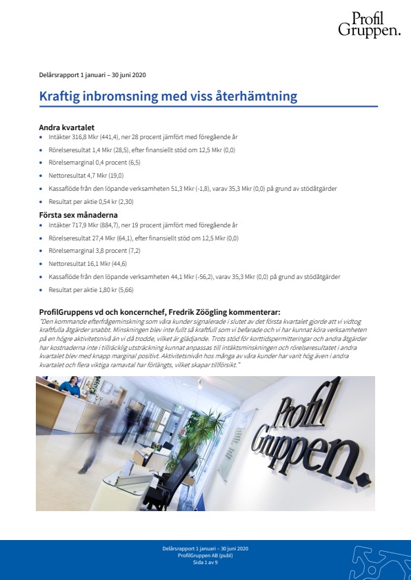 ”Den kommande efterfrågeminskning som våra kunder signalerade i slutet av det första kvartalet gjorde att vi vidtog kraftfulla åtgärder snabbt. Minskningen blev inte fullt så kraftfull som vi befarade och vi har kunnat köra verksamheten på en högre aktivitetsnivå än vi då trodde, vilket är glädjande. Trots stöd för korttidspermitteringar och andra åtgärder har kostnaderna inte i tillräcklig utsträckning kunnat anpassas till intäktsminskningen och rörelseresultatet i andra kvartalet blev med knapp marginal positivt. Aktivitetsnivån hos många av våra kunder har varit hög även i andra kvartalet och flera viktiga ramavtal har förlängts, vilket skapar tillförsikt.”