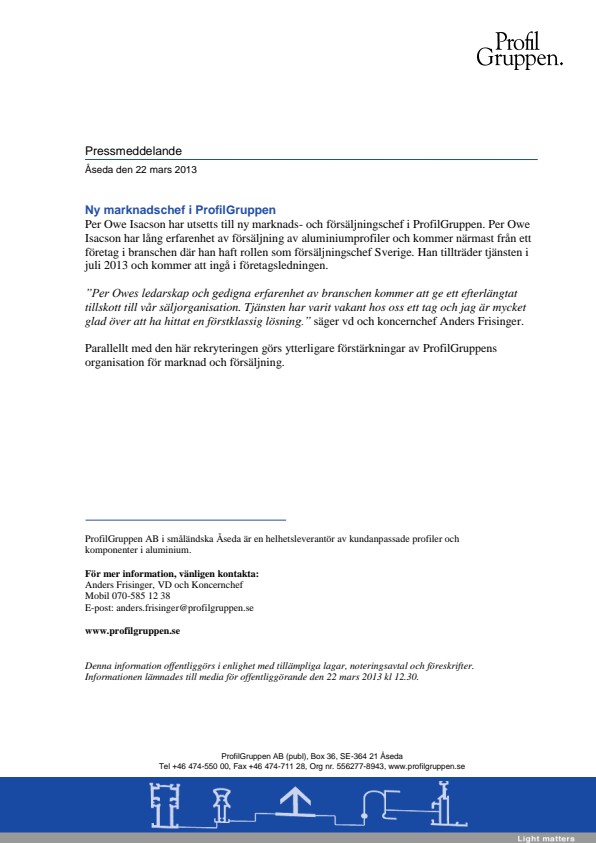 Per Owe Isacson har utsetts till ny marknads- och försäljningschef i ProfilGruppen. Per Owe Isacson har lång erfarenhet av försäljning av aluminiumprofiler och kommer närmast från ett företag i branschen där han haft rollen som försäljningschef Sverige. Han tillträder tjänsten i juli 2013 och kommer att ingå i företagsledningen.