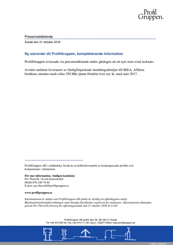 Avtalet omfattar leveranser av färdigförpackade inredningsdetaljer till IKEA. Affären beräknas omsätta totalt cirka 350 Mkr jämnt fördelat över sex år, med start 2017.