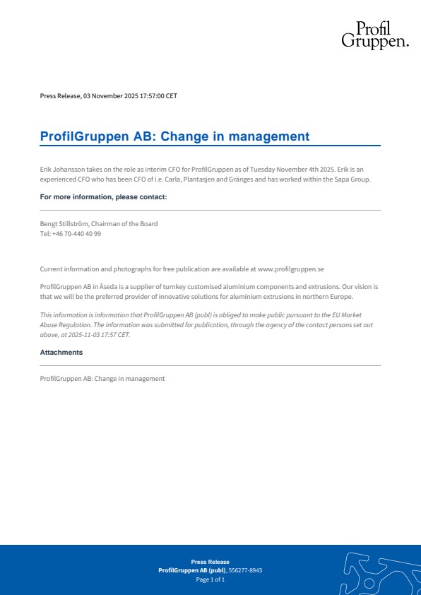 Erik Johansson takes on the role as interim CFO for ProfilGruppen as of Tuesday November 4th 2025. Erik is an experienced CFO who has been CFO of i.e. Carla, Plantasjen and Gränges and has worked within the Sapa Group.