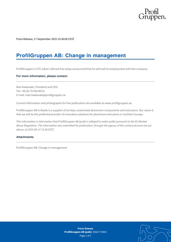 This information is information that ProfilGruppen AB (publ) is obliged to make public pursuant to the EU Market Abuse Regulation. The information was submitted for publication, through the agency of the contact persons set out above, at 2025-09-17 15:30 CEST.