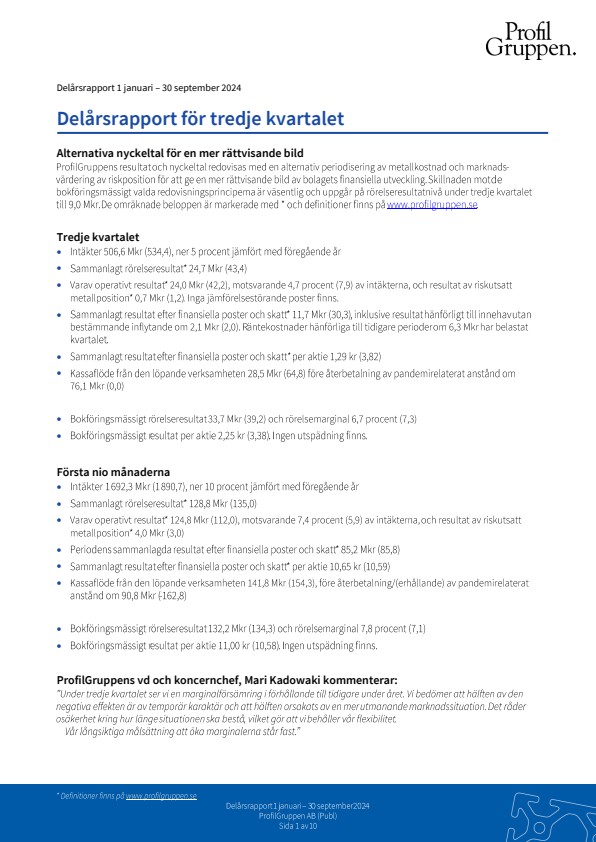 ProfilGruppens resultat och nyckeltal redovisas med en alternativ periodisering av metallkostnad och marknads-värdering av riskposition för att ge en mer rättvisande bild av bolagets finansiella utveckling. Skillnaden mot de bokföringsmässigt valda redovisningsprinciperna är väsentlig och uppgår på rörelseresultatnivå under tredje kvartalet till 9,0 Mkr. De omräknade beloppen är markerade med * och definitioner finns på www.profilgruppen.se.