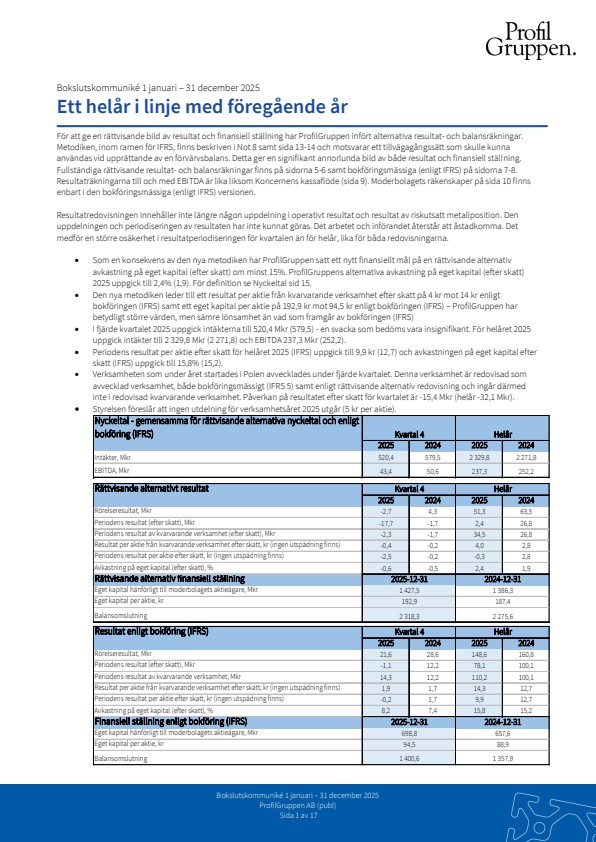 - Som en konsekvens av den nya metodiken har ProfilGruppen satt ett nytt finansiellt mål på en rättvisande alternativ avkastning på eget kapital (efter skatt) om minst 15%. ProfilGruppens alternativa avkastning på eget kapital (efter skatt) 2025 uppgick till 2,4% (1,9). För definition se Nyckeltal sid 15.
