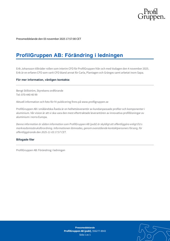 Erik Johansson tillträder rollen som interim CFO för ProfilGruppen från och med tisdagen den 4 november 2025. Erik är en erfaren CFO som varit CFO bland annat för Carla, Plantagen och Gränges samt arbetat inom Sapa.