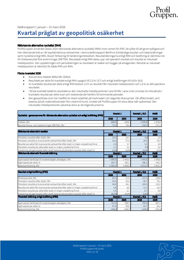ProfilGruppen använder sedan 2025 rättvisande alternativa nyckeltal (RAN) inom ramen för IFRS. De syftar till att ge en tydligare och mer rättvisande bild av vår kapitalintensiva verksamhet. I denna delårsrapport återfinns fullständiga resultat- och balansräkningar samt nyckeltal enligt RAN, liksom förklaring till beräkningsmetodiken. Resultaträkningarna enligt RAN och bokföring är identiska ner till rörelseresultat före avskrivningar (EBITDA). Resultatet enligt RAN delas upp i ett operativt resultat och resultat av riskutsatt metallposition. Den uppdelningen och periodiseringen av resultaten är osäker och bygger på antaganden. Resultat av riskutsatt metallposition är identiskt för både IFRS och RAN.