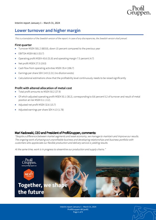 - Of which adjusted operating profit MSEK 50.1 (30.2), corresponding to 8.6 percent 5.2 of turnover and result of metal position at risk MSEK 0.1 (-3.2)