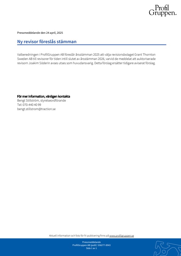 Valberedningen i ProfilGruppen AB föreslår årsstämman 2025 att välja revisionsbolaget Grant Thornton Sweden AB till revisorer för tiden intill slutet av årsstämman 2026, varvid de meddelat att auktoriserade revisorn Joakim Söderin avses utses som huvudansvarig. Detta förslag ersätter tidigare aviserat förslag.