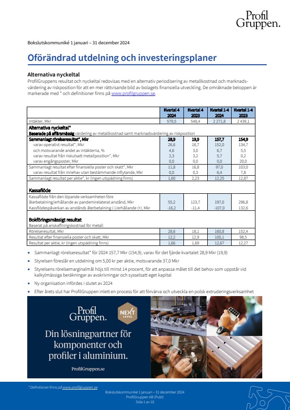 ProfilGruppens resultat och nyckeltal redovisas med en alternativ periodisering av metallkostnad och marknads-värdering av riskposition för att en mer rättvisande bild av bolagets finansiella utveckling. De omräknade beloppen är markerade med * och definitioner finns på www.profilgruppen.se.