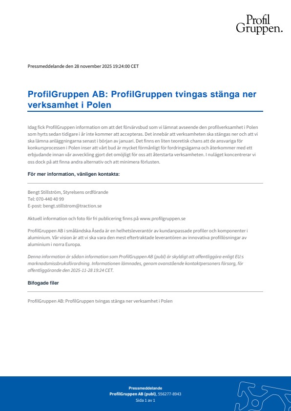 Idag fick ProfilGruppen information om att det förvärvsbud som vi lämnat avseende den profilverksamhet i Polen som hyrts sedan tidigare i år inte kommer att accepteras. Det innebär att verksamheten ska stängas ner och att vi ska lämna anläggningarna senast i början av januari. Det finns en liten teoretisk chans att de ansvariga för konkursprocessen i Polen inser att vårt bud är mycket förmånligt för fordringsägarna och återkommer med ett erbjudande innan vår avveckling gjort det omöjligt för oss att återstarta verksamheten. I nuläget koncentrerar vi oss dock på att finna andra alternativ och att minimera förlusten.