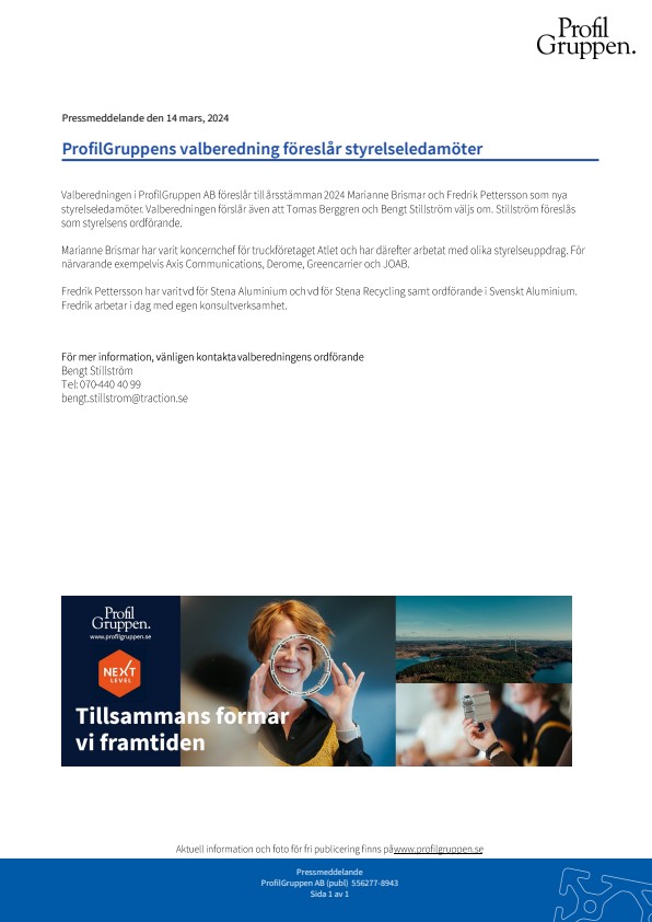 Valberedningen i ProfilGruppen AB föreslår till årsstämman 2024 Marianne Brismar och Fredrik Pettersson som nya styrelseledamöter. Valberedningen förslår även att Tomas Berggren och Bengt Stillström väljs om. Stillström föreslås som styrelsens ordförande.