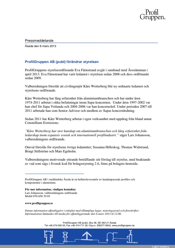 ”Kåre Wetterberg har stor kunskap om aluminiumbranschen och lång erfarenhet från ledarskap inom expansiv svensk och internationell profilindustri.” säger Lars Johansson, valberedningens ordförande.