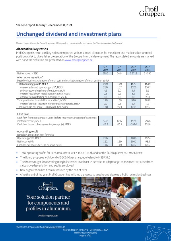 - After the end of the year, ProfilGruppen has initiated a process to acquire and develop a Polish extrusion business
