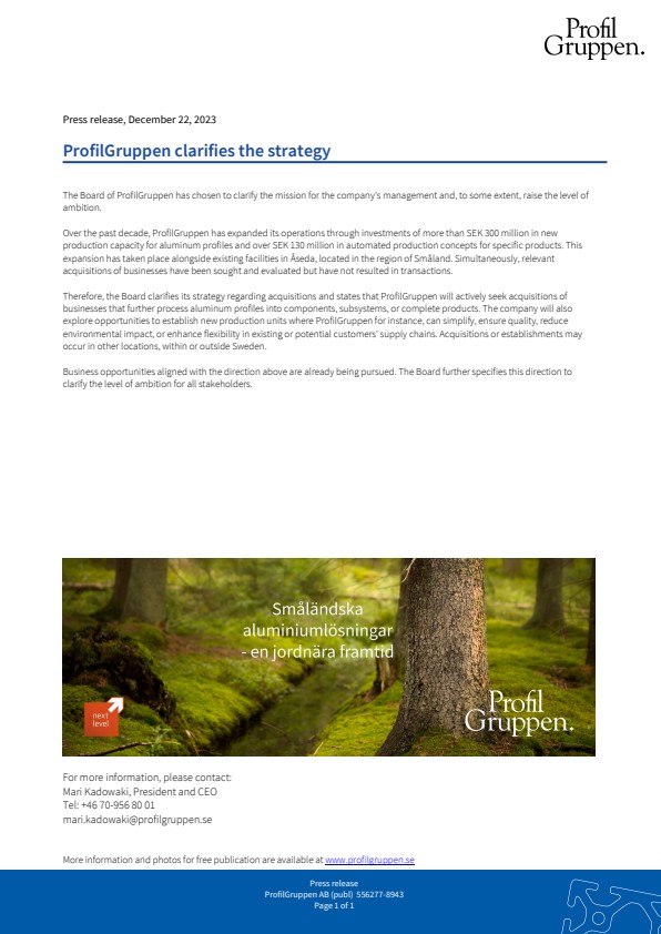 Therefore, the Board clarifies its strategy regarding acquisitions and states that ProfilGruppen will actively seek acquisitions of businesses that further process aluminum profiles into components, subsystems, or complete products. The company will also explore opportunities to establish new production units where ProfilGruppen for instance, can simplify, ensure quality, reduce environmental impact, or enhance flexibility in existing or potential customers’ supply chains. Acquisitions or establishments may occur in other locations, within or outside Sweden.
