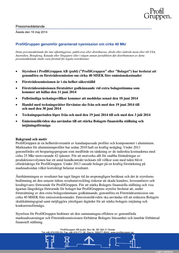 Informationen i detta pressmeddelande utgör inte ett erbjudande att förvärva, teckna eller på annat sätt handla med aktier, teckningsrätter eller andra värdepapper i ProfilGruppen. Inbjudan till berörda personer att teckna aktier i ProfilGruppen kommer endast att ske genom det prospekt som ProfilGruppen beräknar kunna offentliggöra omkring den 18 juni 2014.