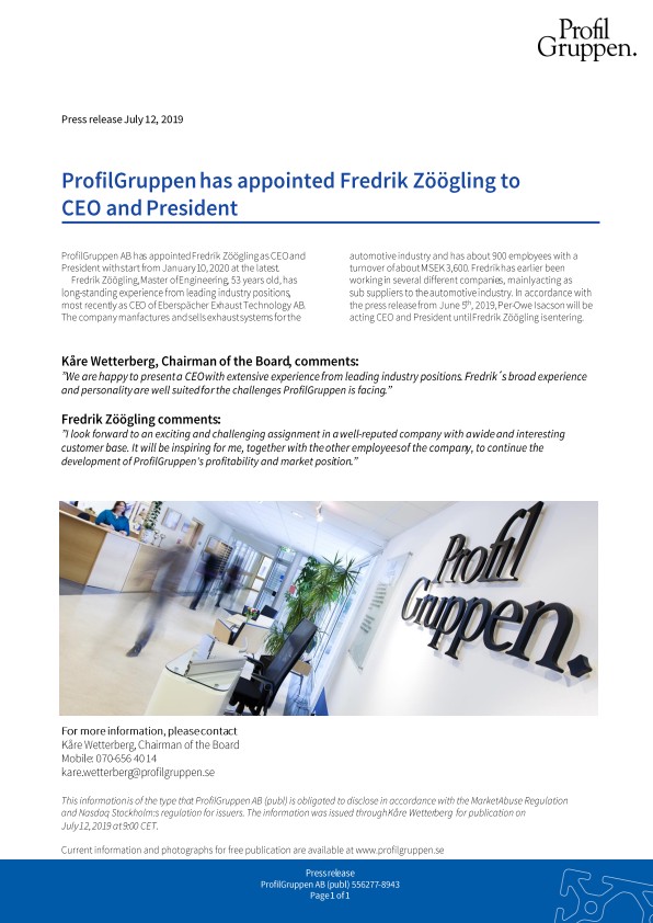 ProfilGruppen AB has appointed Fredrik Zöögling as CEO and President with start from January 10, 2020 at the latest.