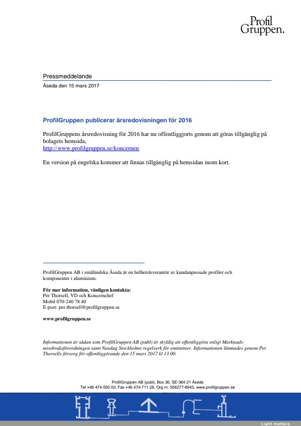 ProfilGruppens årsredovisning för 2016 har nu offentliggjorts genom att göras tillgänglig på bolagets hemsida,