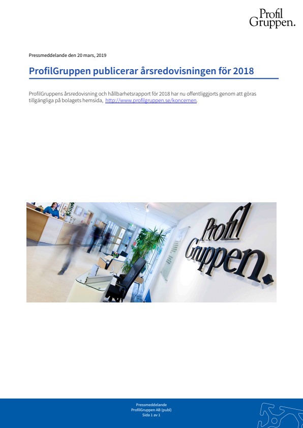 ProfilGruppens årsredovisning och hållbarhetsrapport för 2018 har nu offentliggjorts genom att göras tillgängliga på bolagets hemsida, http://www.profilgruppen.se/koncernen.