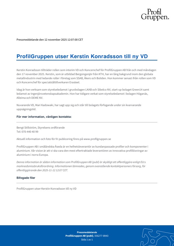Kerstin Konradsson tillträder rollen som interim VD och Koncernchef för ProfilGruppen AB från och med måndagen den 17 november 2025. Kerstin, som är utbildad Bergsingenjör från KTH, har en lång bakgrund inom den globala metallindustrin med ledande roller i företag som SSAB, Åkers och Boliden. Hon kommer senast ifrån rollen som VD och Koncernchef för specialståltillverkaren Erasteel.