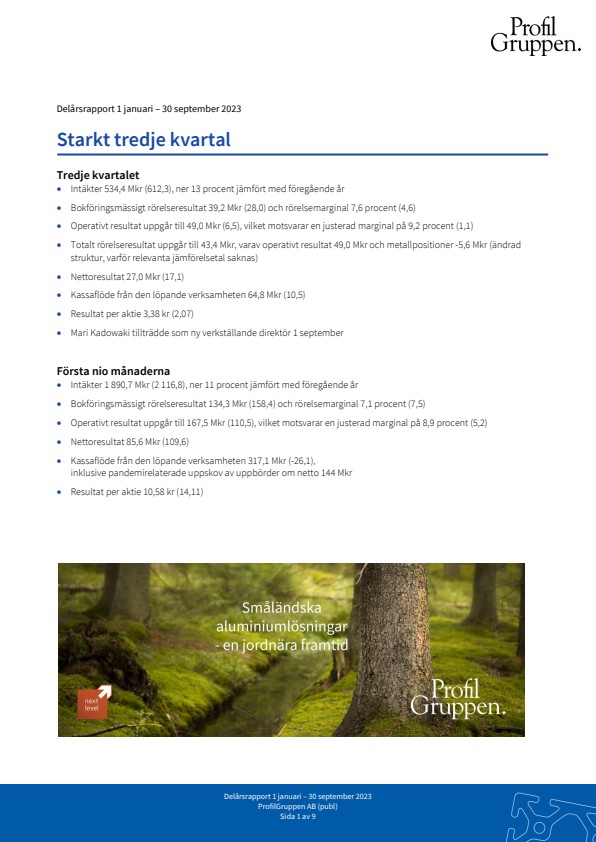 •Totalt rörelseresultat uppgår till 43,4 Mkr, varav operativt resultat 49,0 Mkr och metallpositioner -5,6 Mkr (ändrad struktur, varför relevanta jämförelsetal saknas)