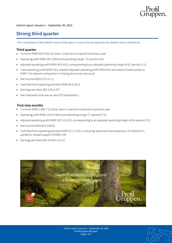 •Total operating profit MSEK 43.4, whereof adjusted operating profit MSEK 49.0 and result of metal positions MSEK -5.6 (relevant comparison is missing due to new structure)