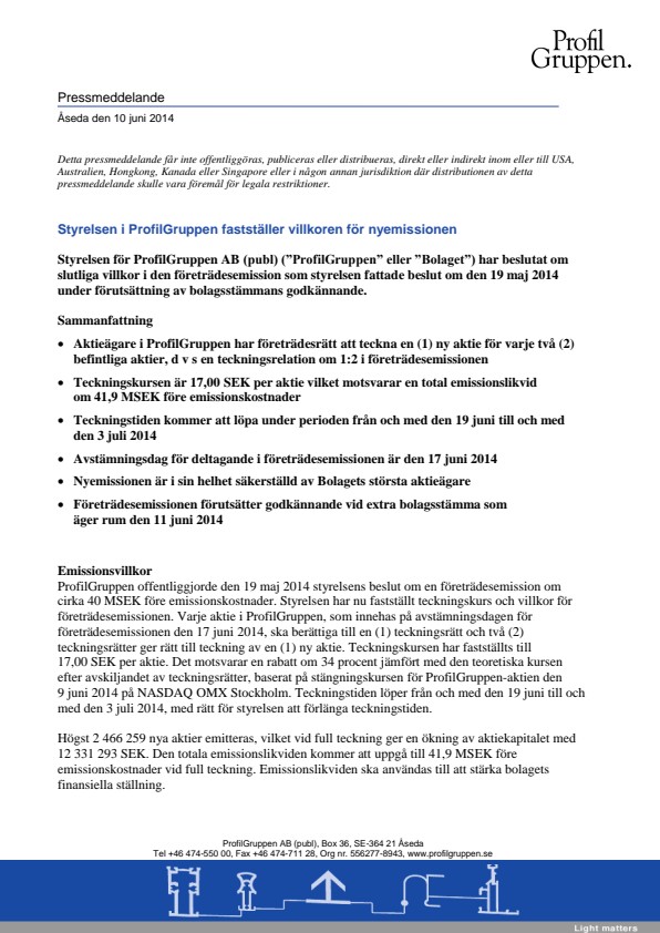 Styrelsen för ProfilGruppen AB (publ) (”ProfilGruppen” eller ”Bolaget”) har beslutat om slutliga villkor i den företrädesemission som styrelsen fattade beslut om den 19 maj 2014 under förutsättning av bolagsstämmans godkännande.