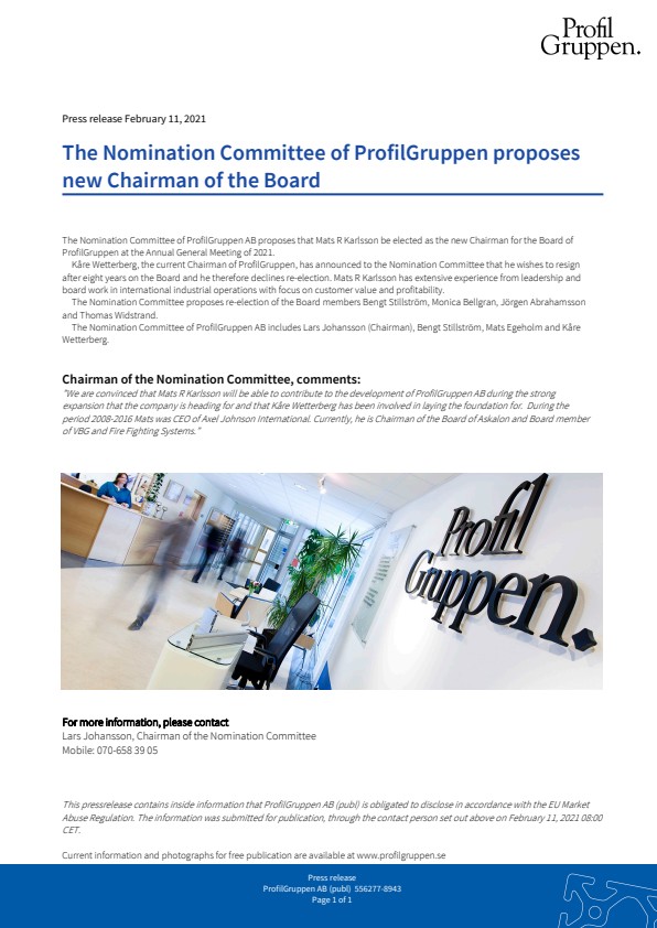 The Nomination Committee of ProfilGruppen AB proposes that Mats R Karlsson be elected as the new Chairman for the Board of ProfilGruppen at the Annual General Meeting of 2021.