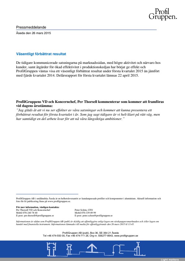 De tidigare kommunicerade satsningarna på marknadssidan, med högre aktivitet och närvaro hos kunder, samt åtgärder för ökad effektivitet i produktionskedjan har börjat ge effekt och ProfilGruppen väntas visa ett väsentligt förbättrat resultat under första kvartalet 2015 än jämfört med fjärde kvartalet 2014. Delårsrapport för första kvartalet lämnas 22 april 2015.